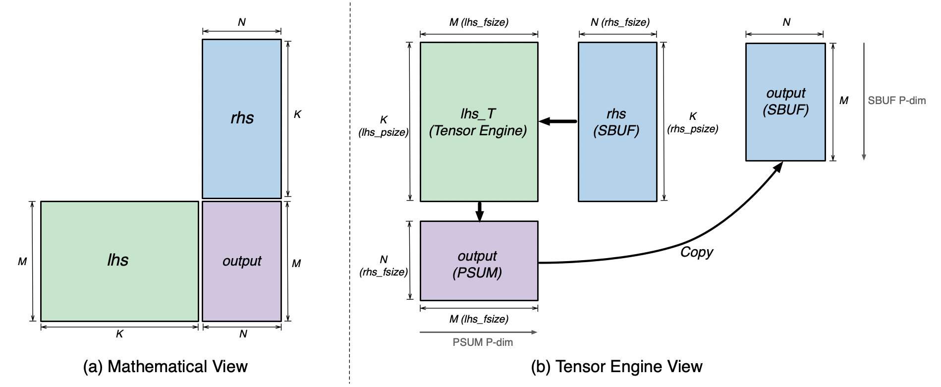 Tensor Engine (TensorE) and SRAMs from its original mathematical view. Note, the PSUM