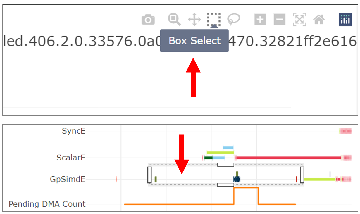 You can click and drag on the timeline to select a range of instructions using the Box Select functionality. A summary will be produced that includes which lines of NKI source code produced these instructions. This helps with understanding a portion of the timeline. Selecting a large number of instructions may take some time to retrieve from the database.