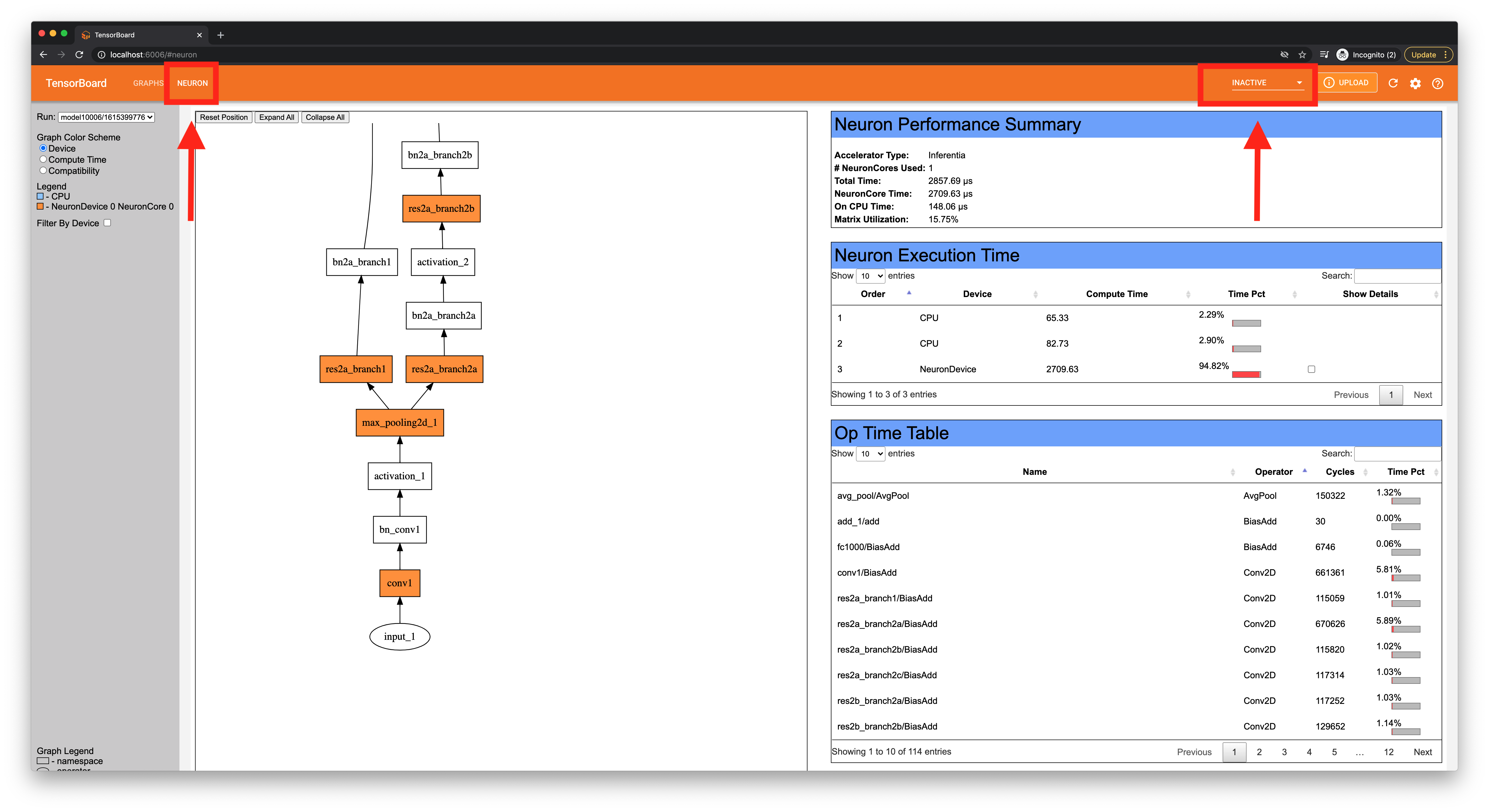 On the right side of the Neuron plugin, information on the profiled inference will be displayed.