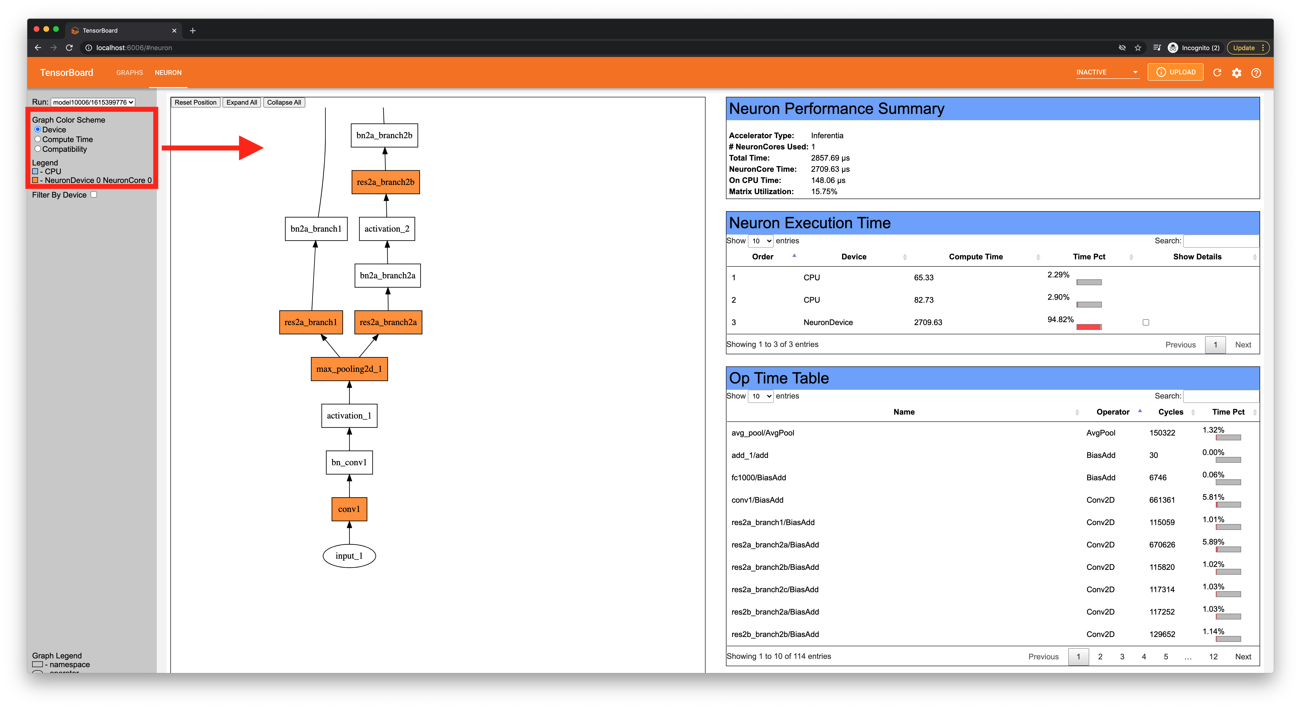 Additionally, you can choose to filter by CPU and NeuronCores, which will only color ops that match the selected device(s).