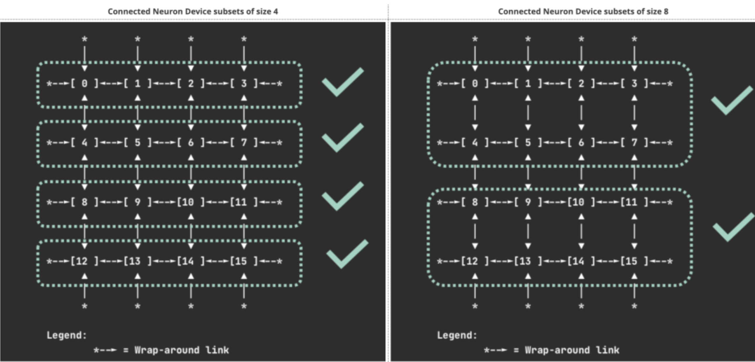 Allocate connected neuron devices from trn2 instance type and the devices in the set need to be running specified Neuron driver version.