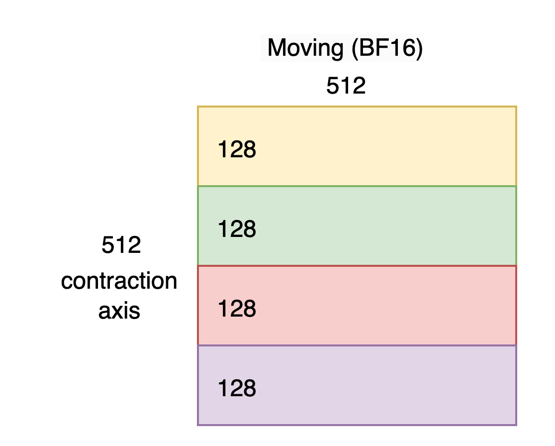 Notice the shape is now [128P, 512F] which is the max moving tile size we aimed for. But each MXFP_x4 element, shown in red, physically contains four quantized elements from the original tile. Recall that each TensorE processing element ingests enough data to perform four, FP4/FP8 multiply-accumulate operations, which is why four elements from the original contraction axis must be packed together in this fashion.