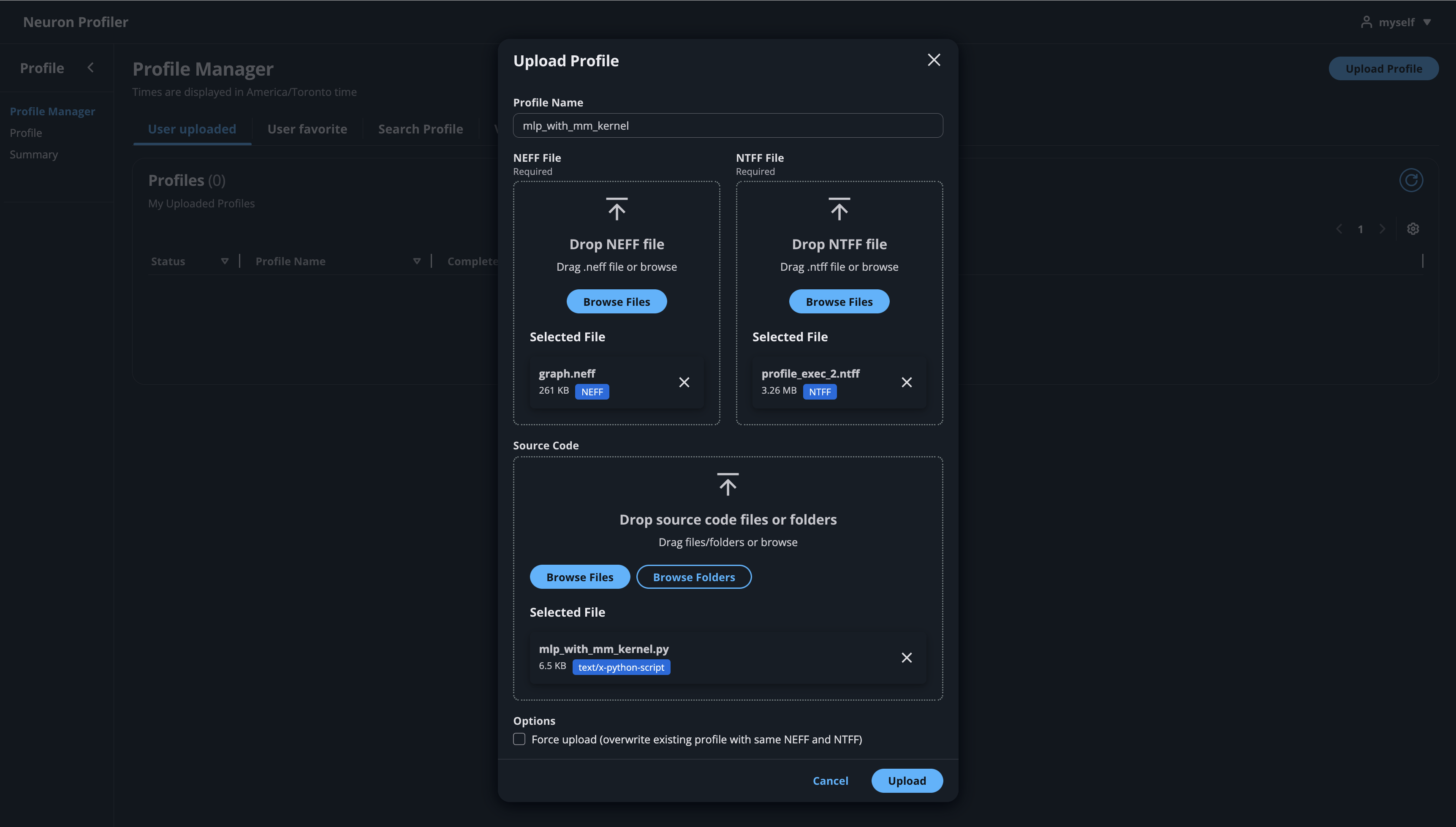 • Click on the button “Upload Profile” to upload NEFF and NTFF files, and give a meaningful name to your profile. Selecting a source code folder for code linking is optional.