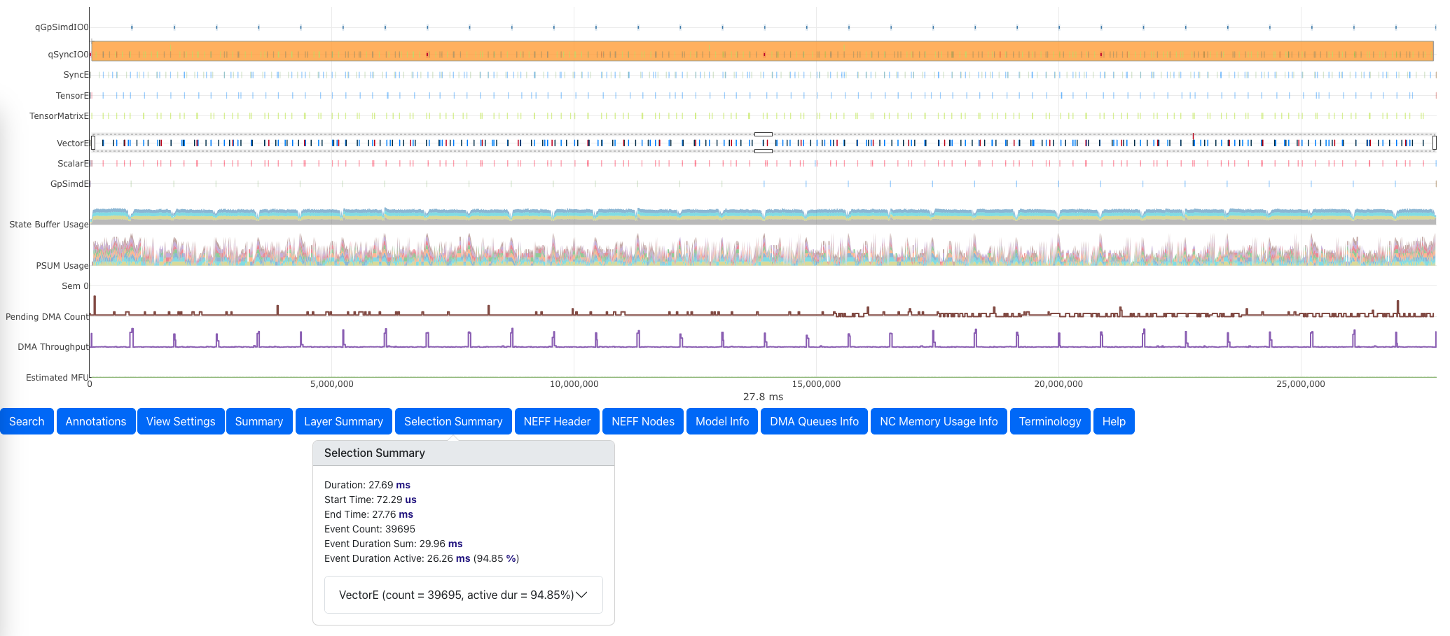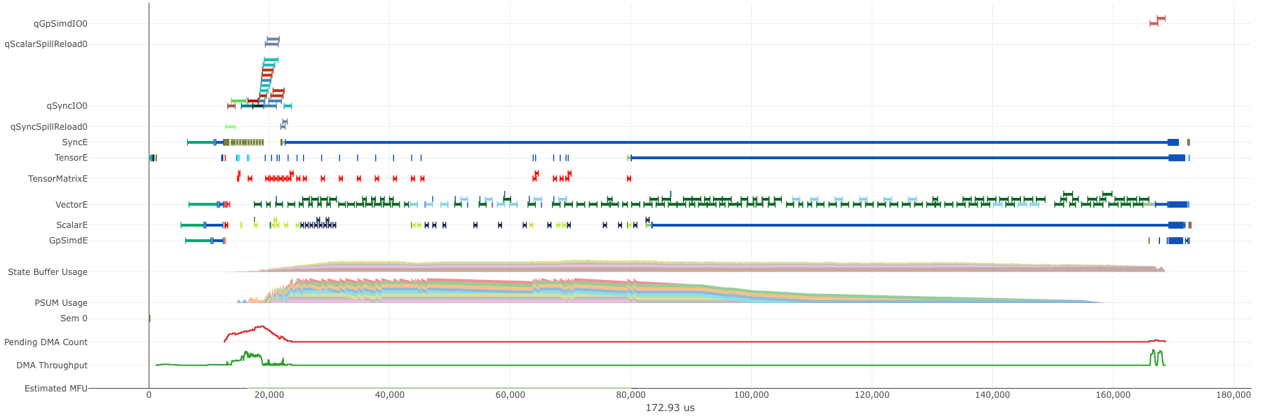 tiling. VectorE is now 94.85% active, and we no longer have spilling related DMA activities.