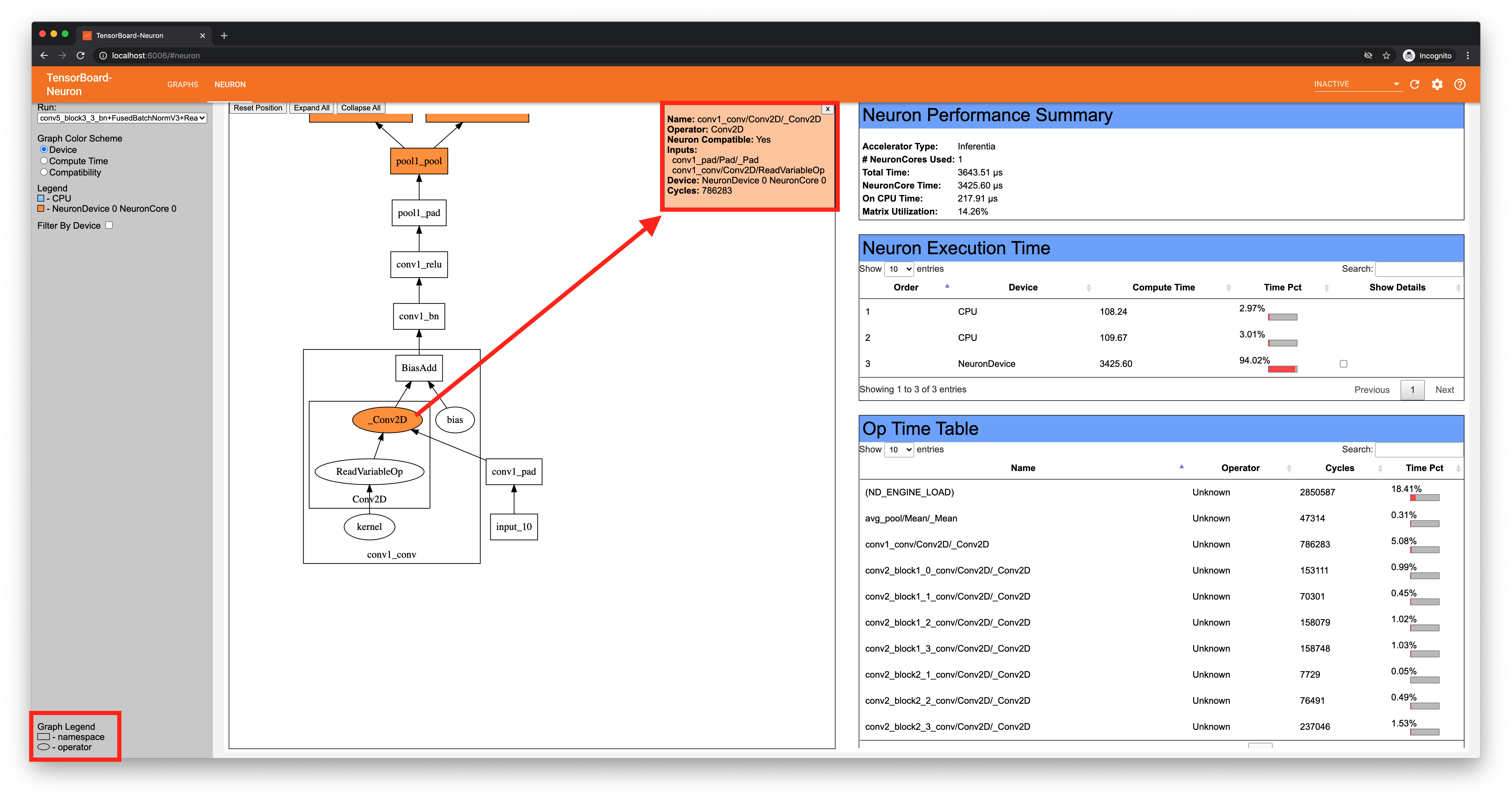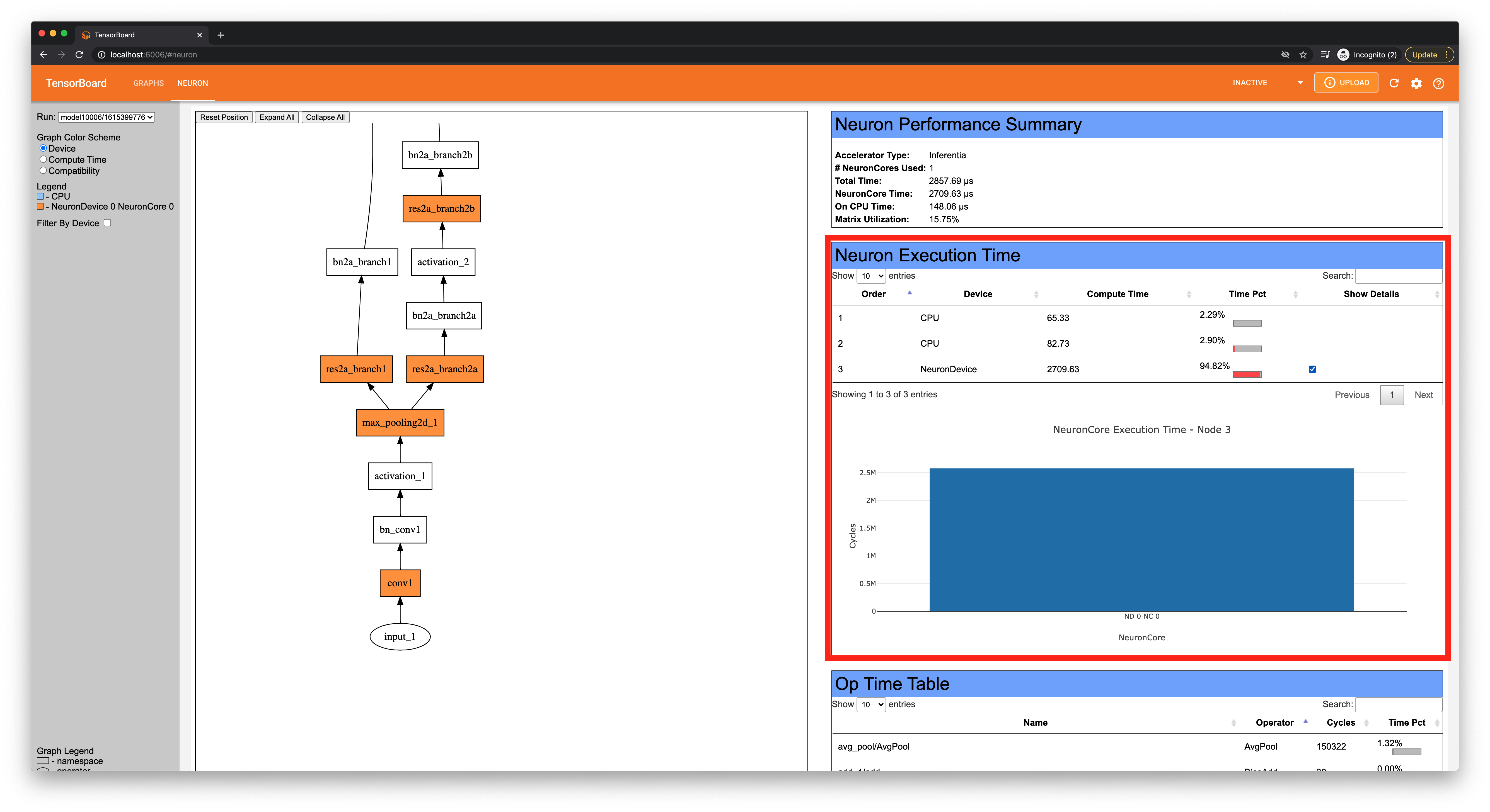 The “Op Time Table” section shows the cycle count per operator, much like the “Compute time” coloring