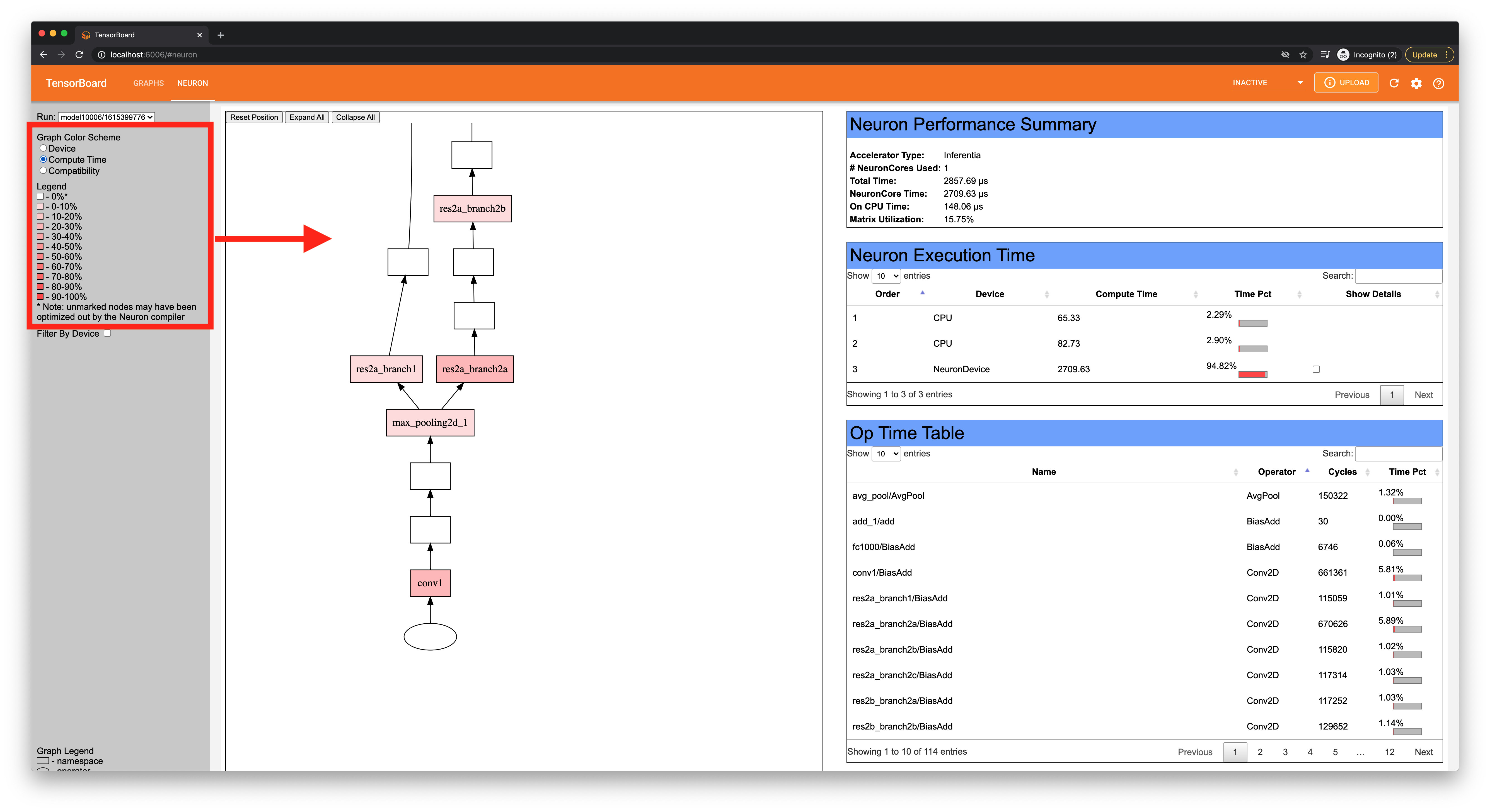This view will show time taken by each layer and will be colored according to how much relative time the layer took to compute. A lighter shade of red means that a relatively small portion of compute time was spent in this layer, while a darker red shows that more compute time was used.