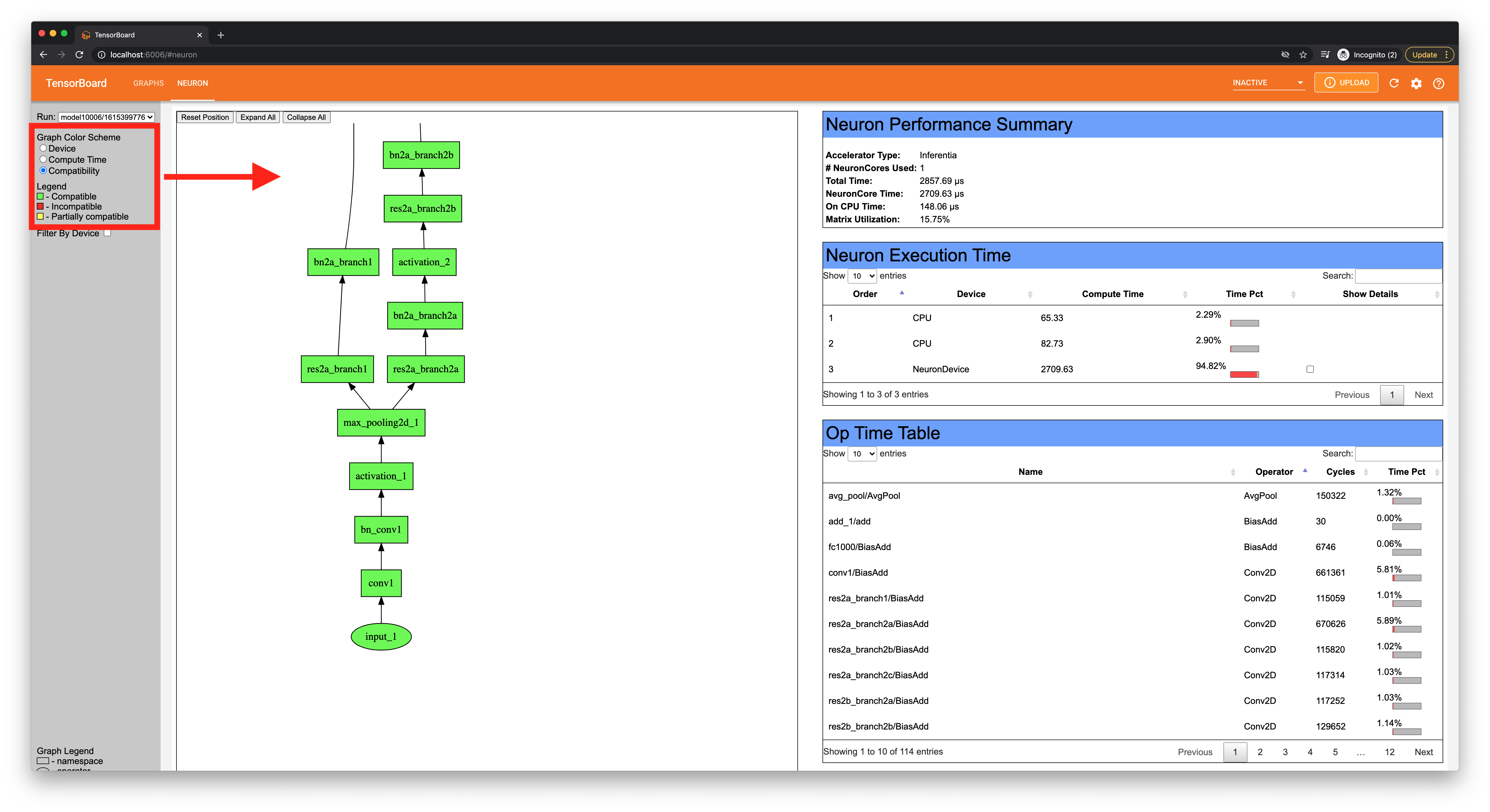 The “Compatibility” color scheme allows you to better understand what operators are currently supported by the Neuron compiler - green for compatible ops, red for incompatible ops, and yellow for subgraphs that contain both compatible and incompatible ops.