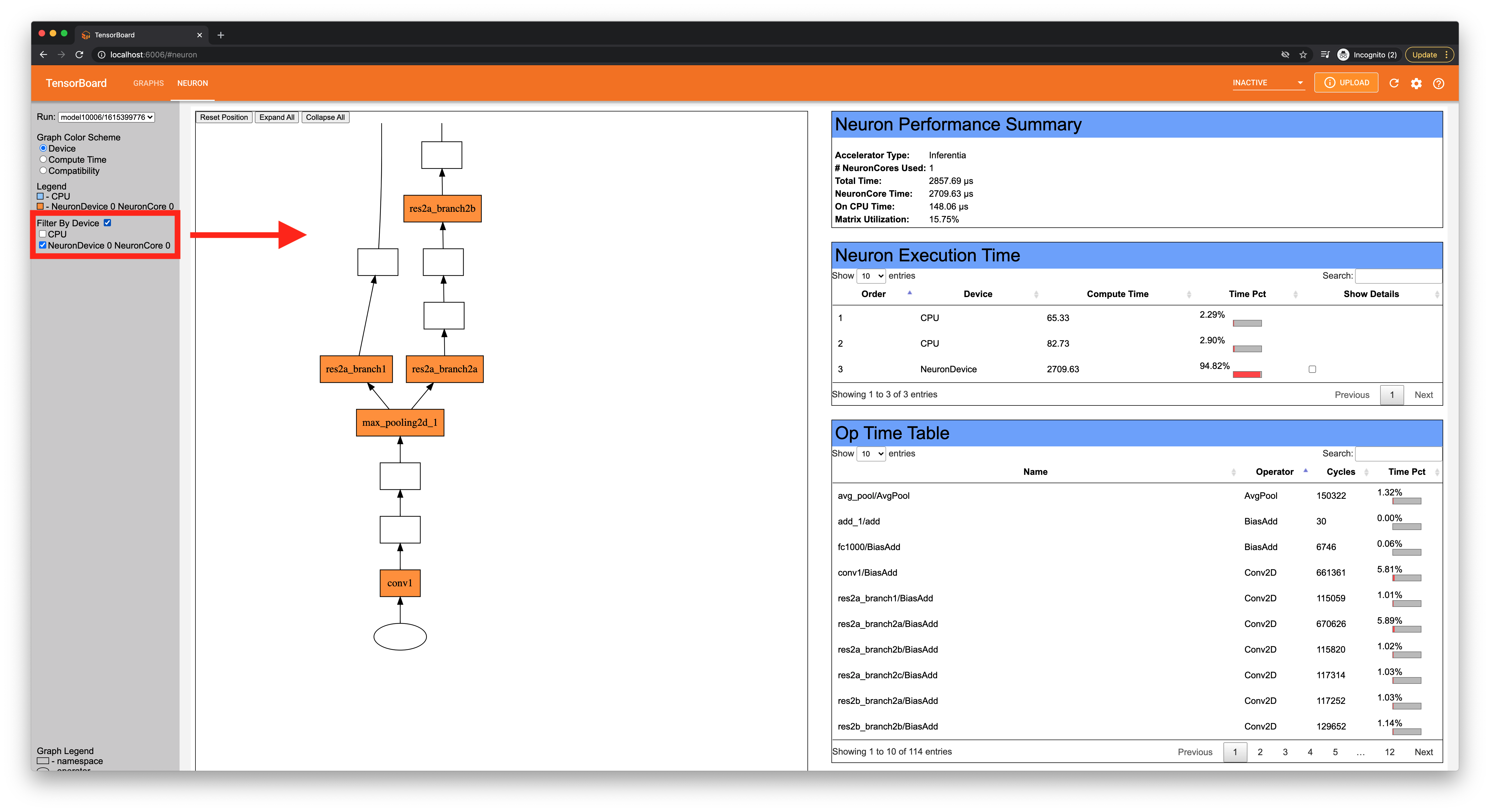 Additionally, you can choose to filter by CPU and NeuronCores, which will only color ops that match the selected device(s).