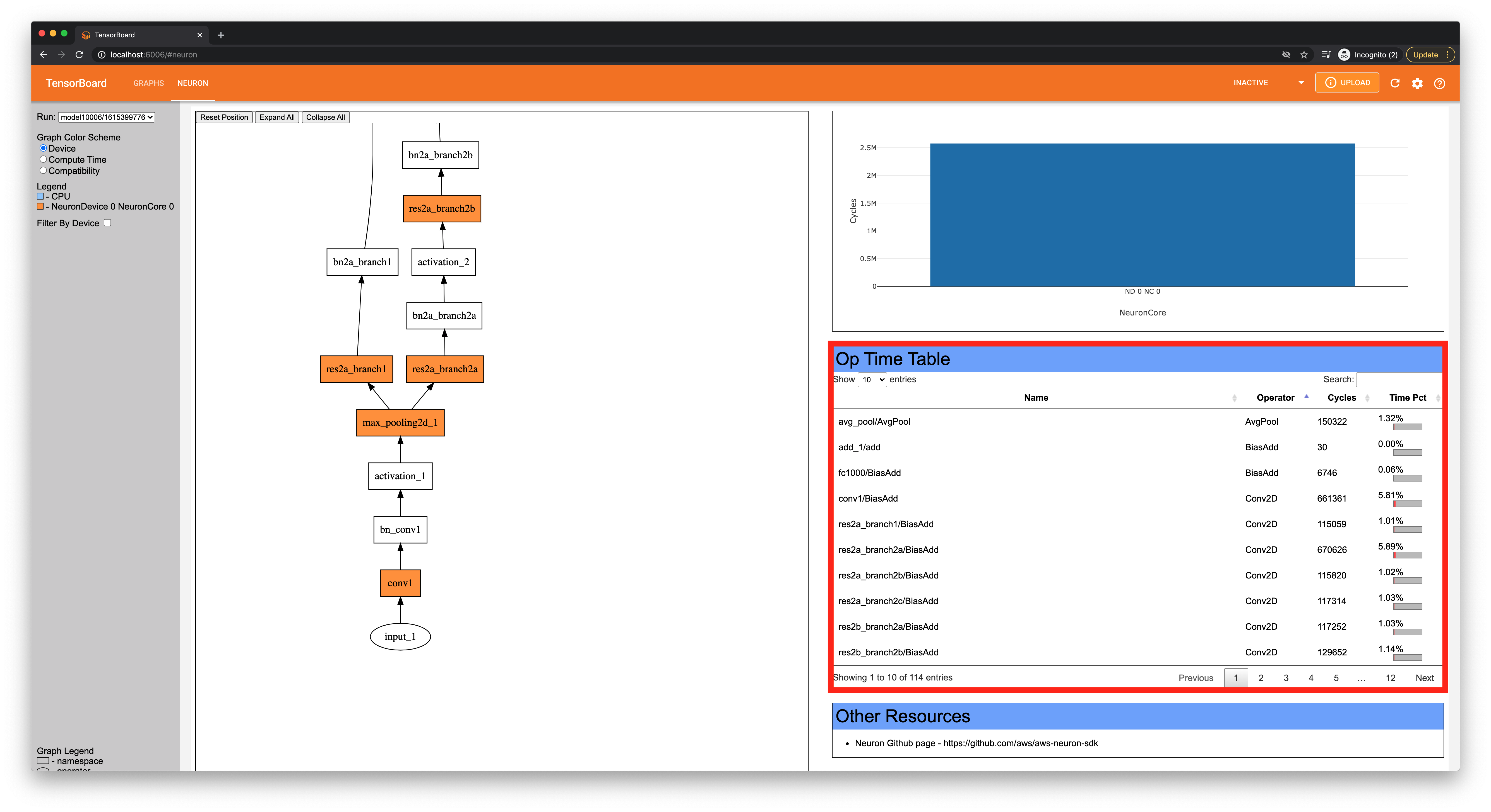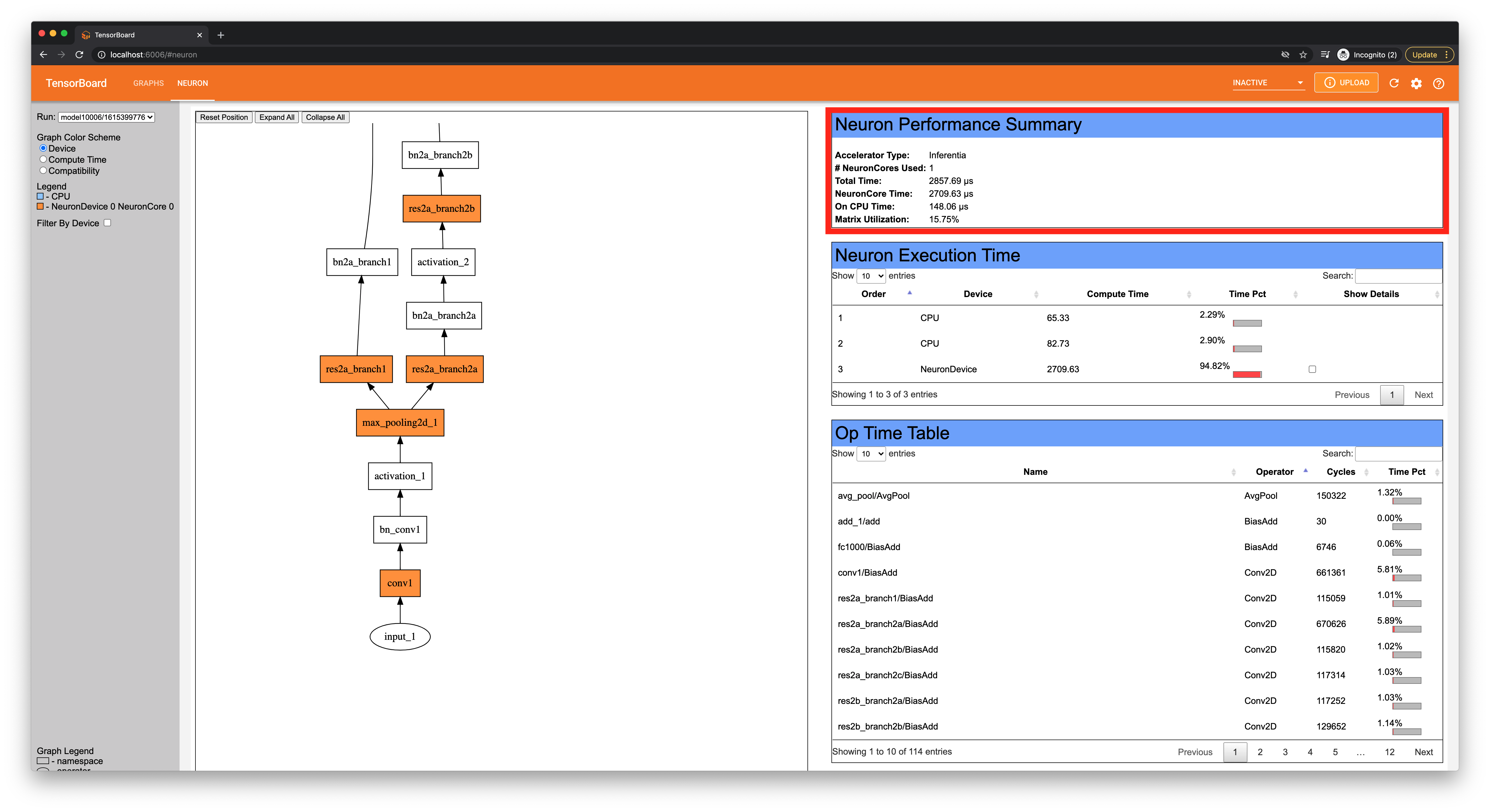 First is the “Neuron Performance Summary,” which gives a quick overview on how Neuron executed the graph, including information on the number of NeuronCores and both on-NeuronCore time and on-CPU time.