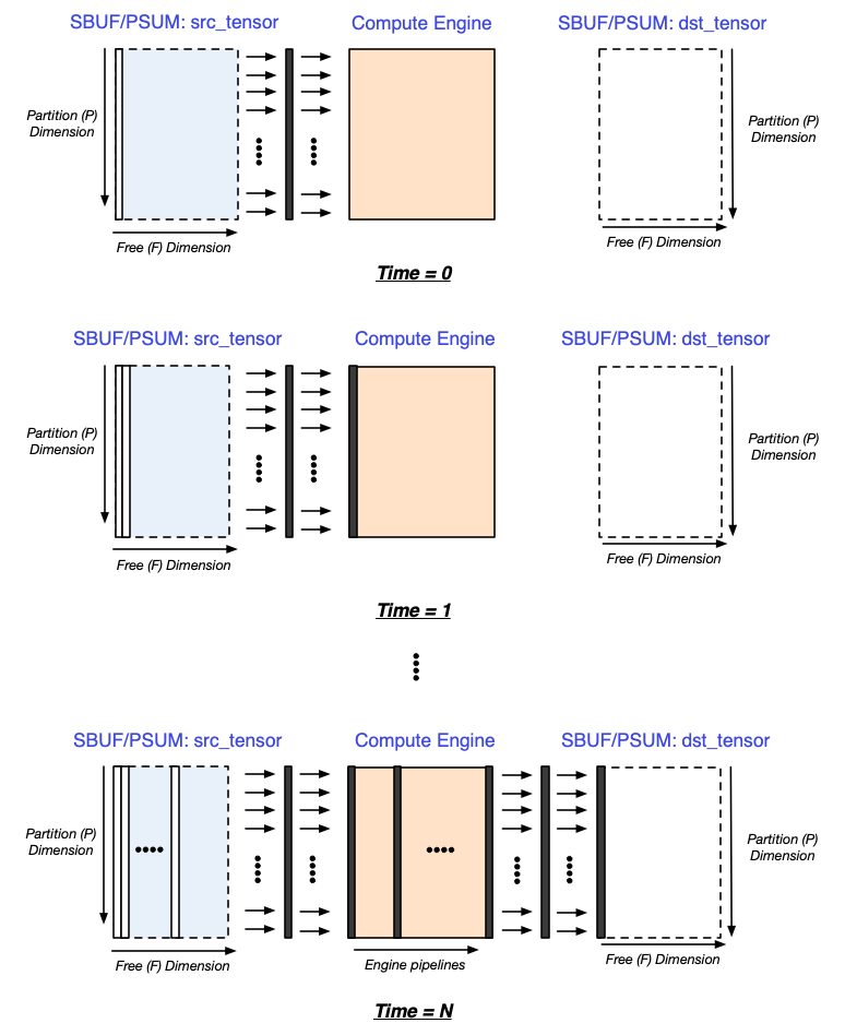 Figure 59 shows a simplified timeline of how compute engines stream data in and out of on-chip SRAM (SBUF or PSUM). Refer to Figure 46 for the available connectivity between engines and SBUF/PSUM. At a high level, the compute engines are able to pipeline data reads, computation and writes along the F dimension of the src/dst tensors. In every cycle, each engine can read 128 elements across 128 SBUF/PSUM partitions, perform a computation on previously read 128 elements, and write 128 previously computed results to SBUF/PSUM. In other words, the P axis of a tensor is the parallel dimension for SBUF/PSUM data accessing, while the F axis of the tensor is the time dimension for data accessing.