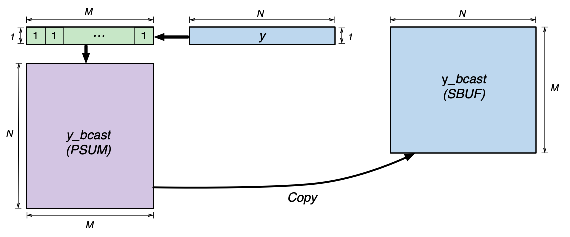 Similarly, we can broadcast a vector occupying a single partition to M (M <= 128) partitions using nki.isa.nc_matmul(ones,
