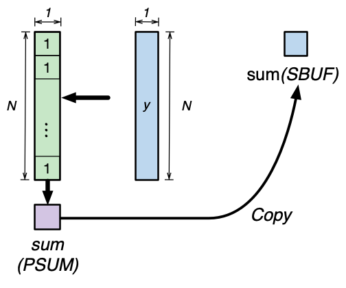 Finally, we can also leverage TensorE for data summation across SBUF partitions (P-dim summation). For example, a vector laid out across SBUF partitions can be reduced into a single sum using TensorE as shown in the diagram below. Note, this utilizes only a single PE column of the TensorE; therefore, depending on the surrounding operators, this may not be the best use of TensorE. If you can do summation within each partition (F-dim summation), see nki.isa.tensor_reduce for an alternative reduction implementation on Vector Engine. It is recommended to choose the engine based on the natural layout of your input data to avoid any transpositions.