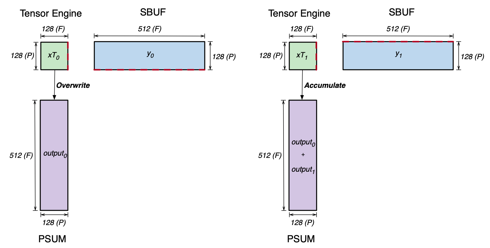 As shown in the diagram above, TensorE must read input matrices from SBUF and write output matrices to PSUM. PSUM also allows near-memory accumulation of multiple matrix multiplication output tiles (detailed usage discussed here).