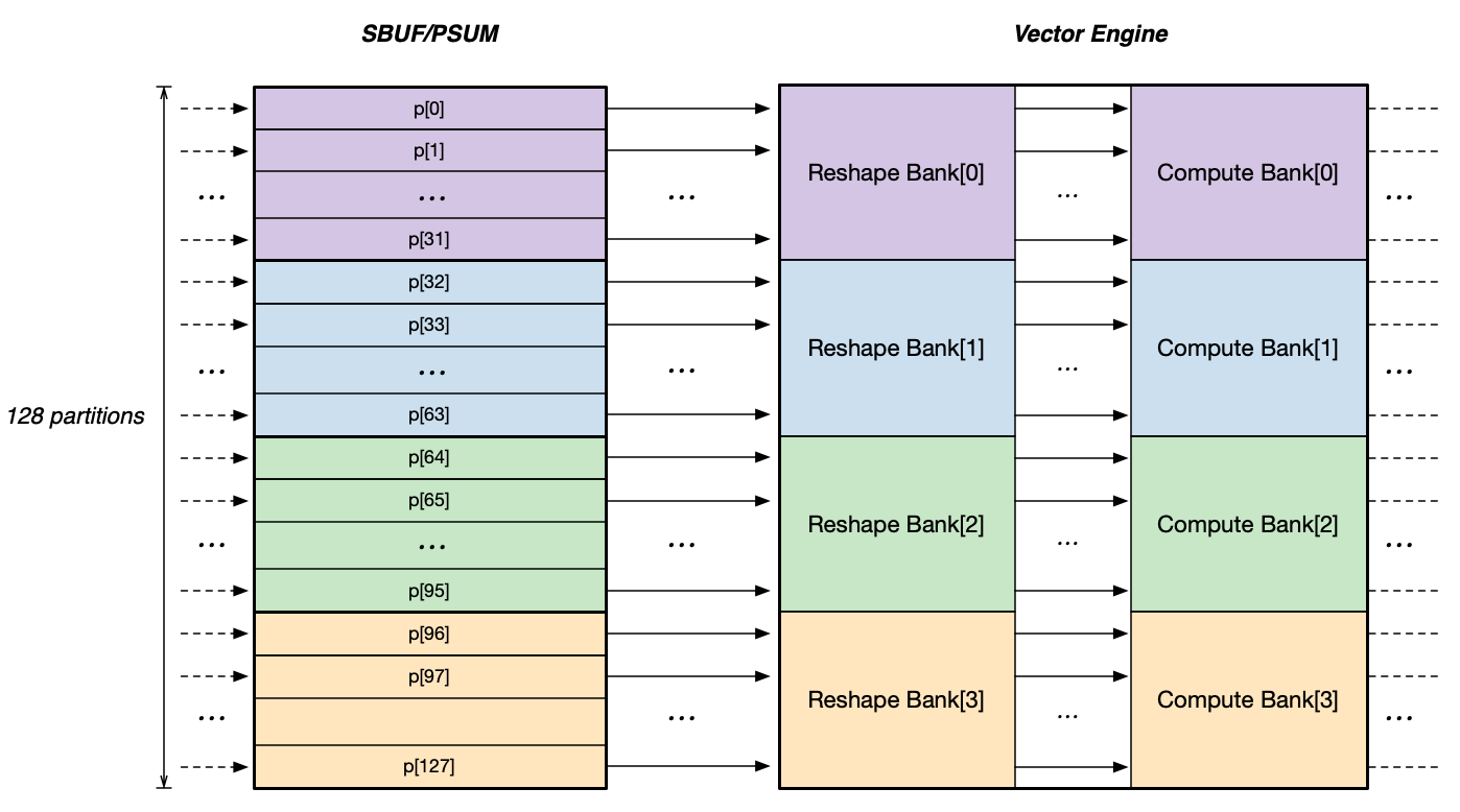 However, when num_partition < 64, VectorE/ScalarE/GpSimdE on NeuronCore-v2 supports two styles of cross-partition