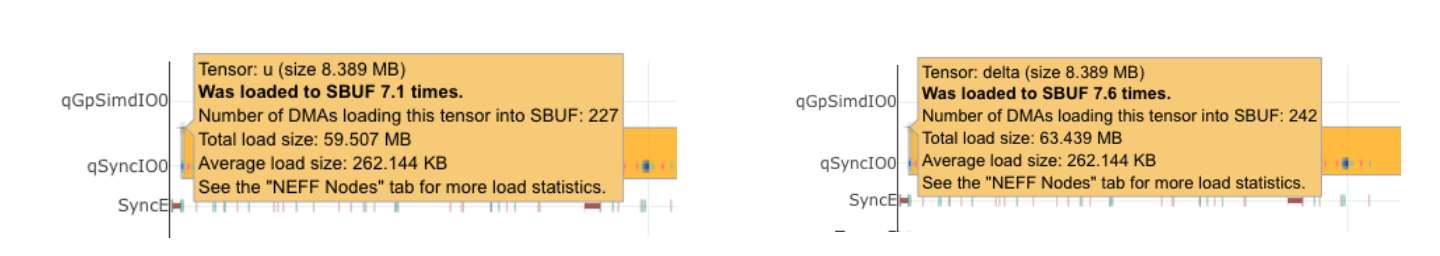 Appending seq_len to the above list, that is, making seq_len the new inner-most loop, would involve the least amount of code changes to our current NKI kernel. However, it will lead to the least amount of SBUF usage reduction, since this loop ordering won’t be tiling scanC_accum, delta_i and u_i tensors. Given seq_len=8192 and FP32 data types, these three tensors will occupy 81924B3 = 96 KiB/partition, half of the available SBUF capacity. Let’s go ahead and experiment this loop ordering in a new kernel mamba_v3: