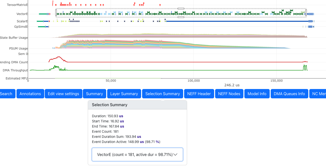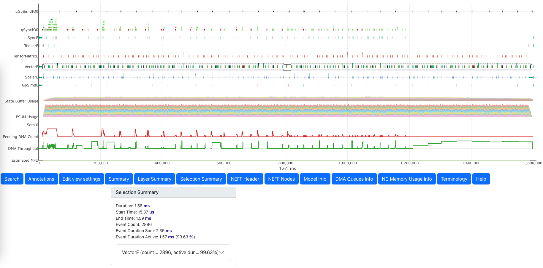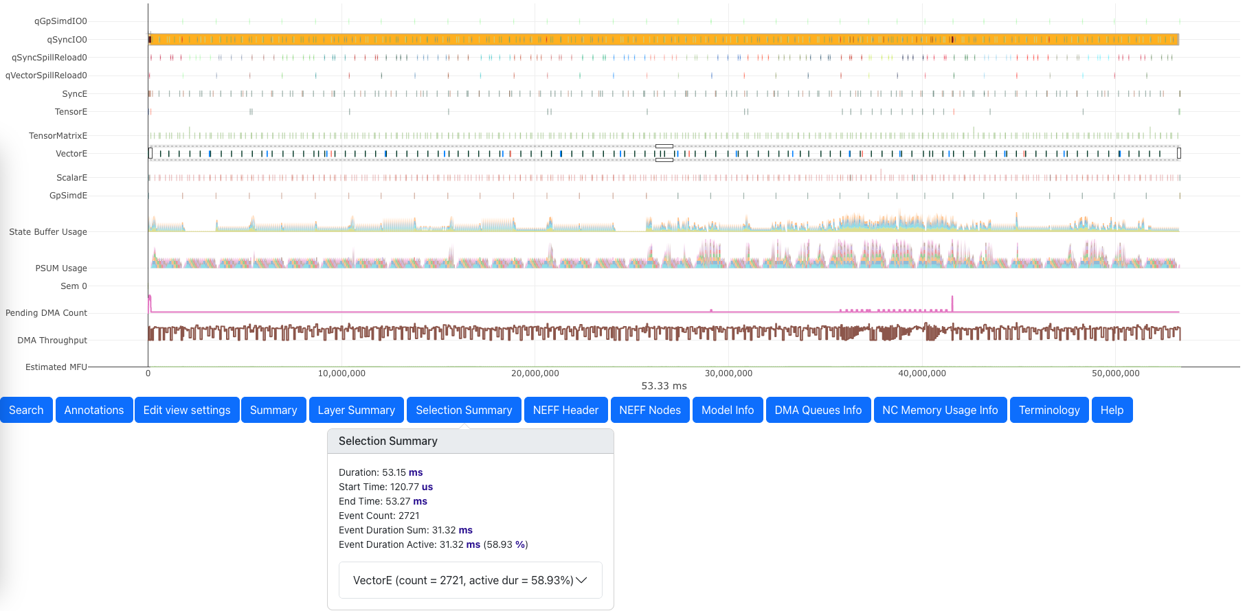 With the above profile, the kernel now takes 27.8 ms, which is 48% reduction in latency compared to no seq_len tiling. VectorE is now 94.85% active, and we no longer have spilling related DMA activities.