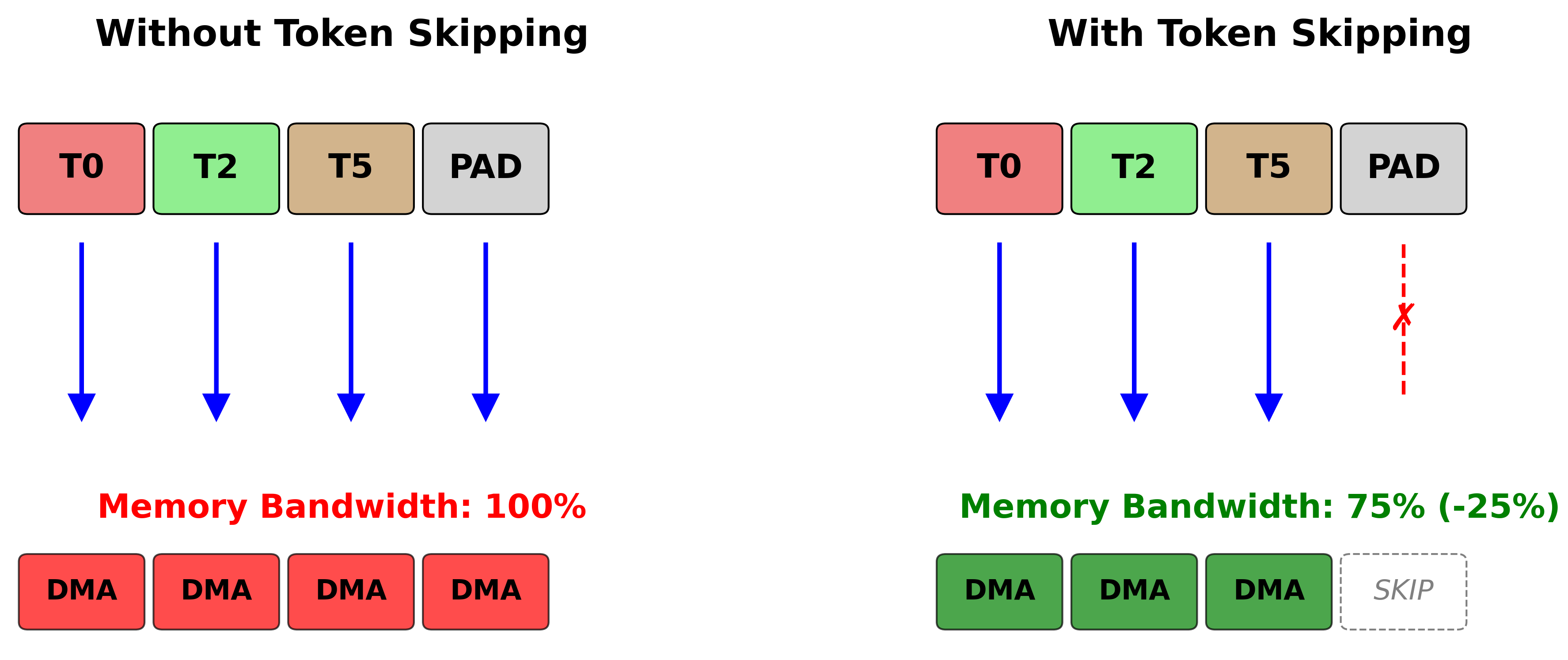 Selective loading addresses the memory bandwidth bottleneck. It loads only the expert weights required for the current batch of tokens, rather than loading all expert weights.
