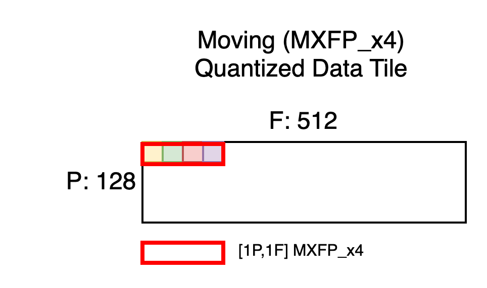 Notice the shape is now [128P, 512F] which is the max moving tile size we aimed for. But each MXFP_x4 element, shown in red, physically contains four quantized elements from the original tile. Recall that each TensorE processing element ingests enough data to perform four, FP4/FP8 multiply-accumulate operations, which is why four elements from the original contraction axis must be packed together in this fashion.