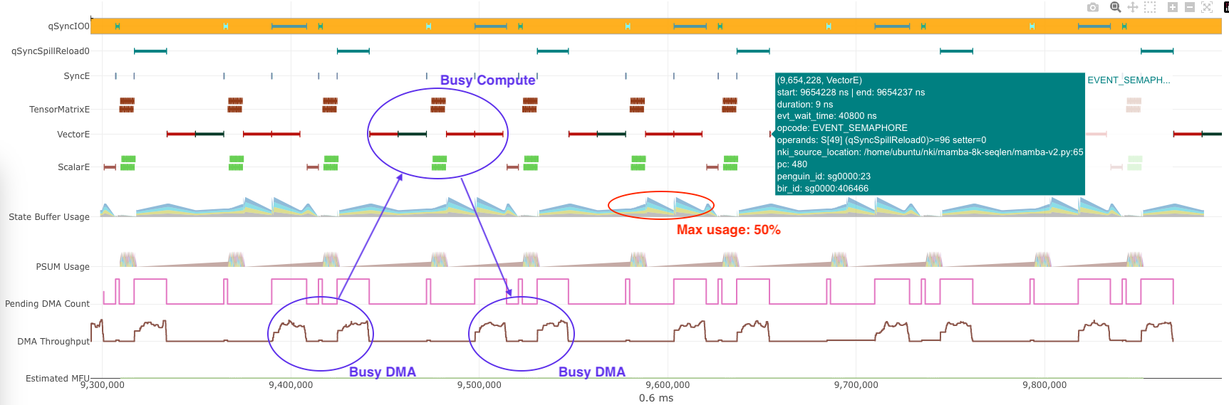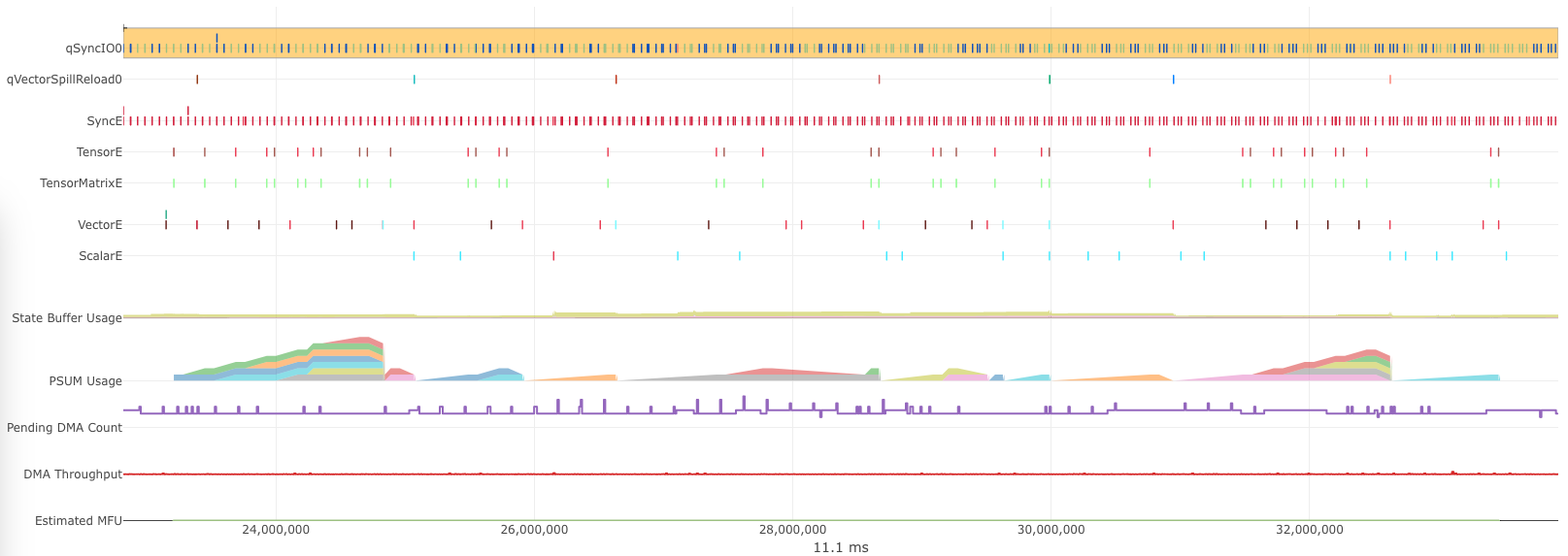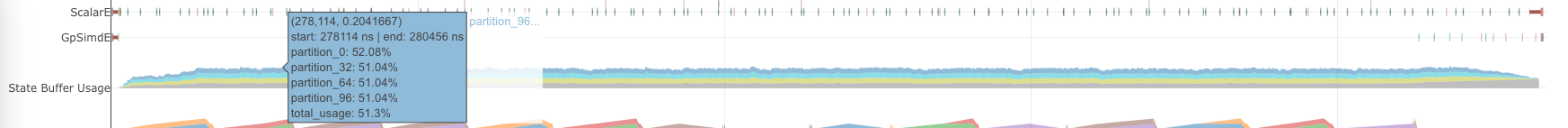 tiling. VectorE is now 94.85% active, and we no longer have spilling related DMA activities.