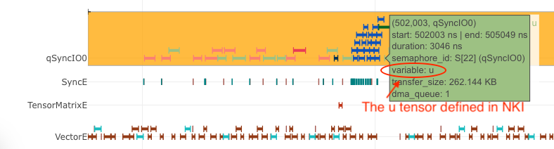 these three tensors will occupy 81924B3 = 96 KiB/partition, half of the available SBUF capacity. Let’s go ahead and